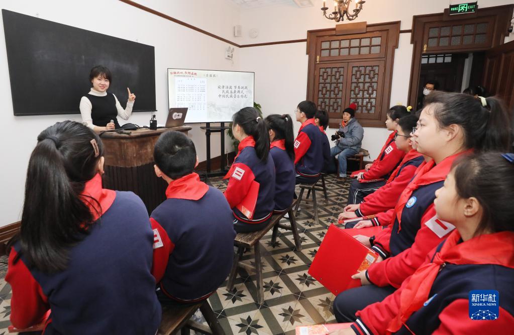 2月15日,上海市虹口區教育學院附屬中學音樂教師劉雨佳(前)在中國左翼作家聯盟成立大會會址紀念館課堂上向同學們講解歌曲演唱技巧。