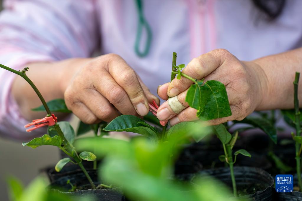 2月15日,工人在貴州省從江縣貫洞鎮百香果育苗基地嫁接百香果苗。