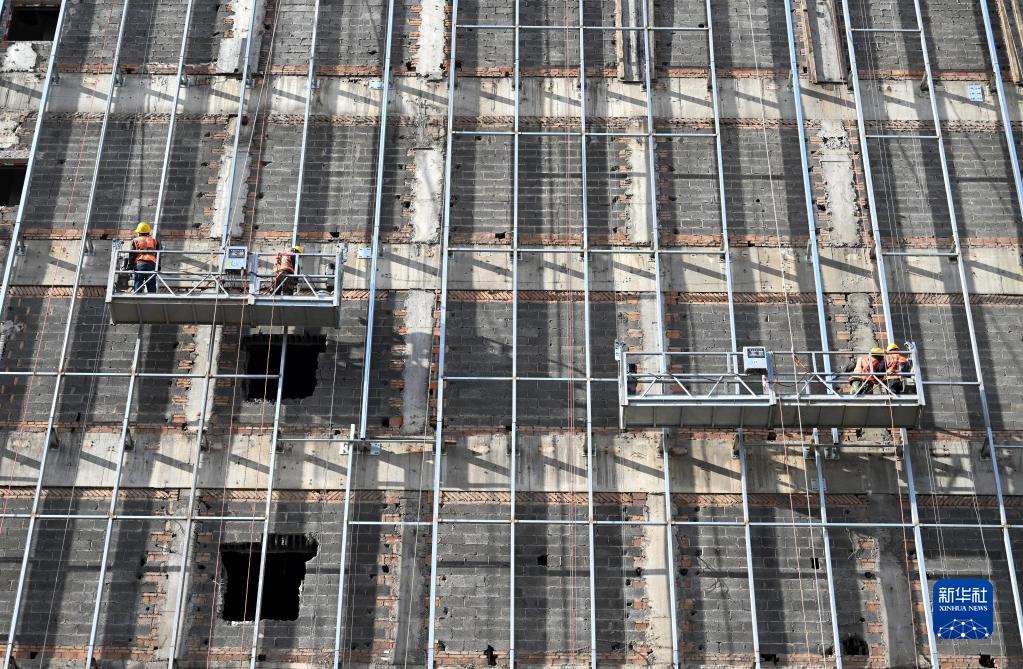 2月14日,工人在位于天津市和平區(qū)金街商圈的印象城項目現(xiàn)場施工。