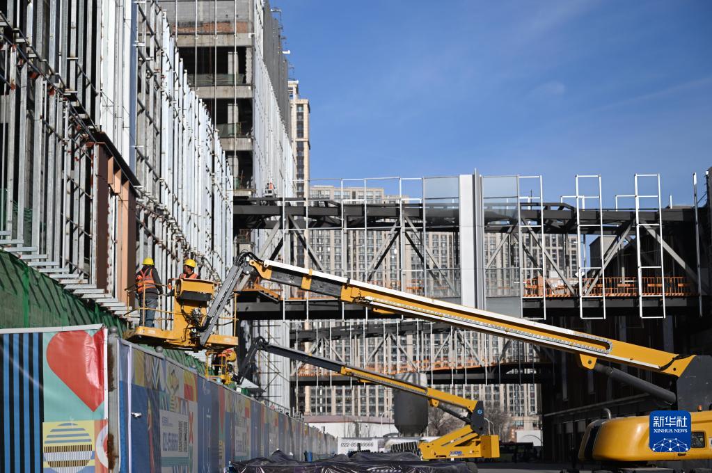 2月14日,工人在位于天津市和平區(qū)金街商圈的印象城項(xiàng)目現(xiàn)場(chǎng)施工。