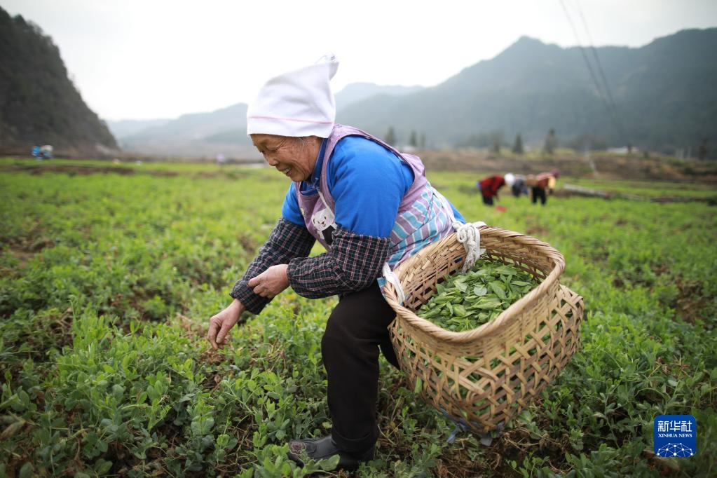 2月15日,在龍里縣灣灘河鎮郊外,菜農在采摘豌豆尖。