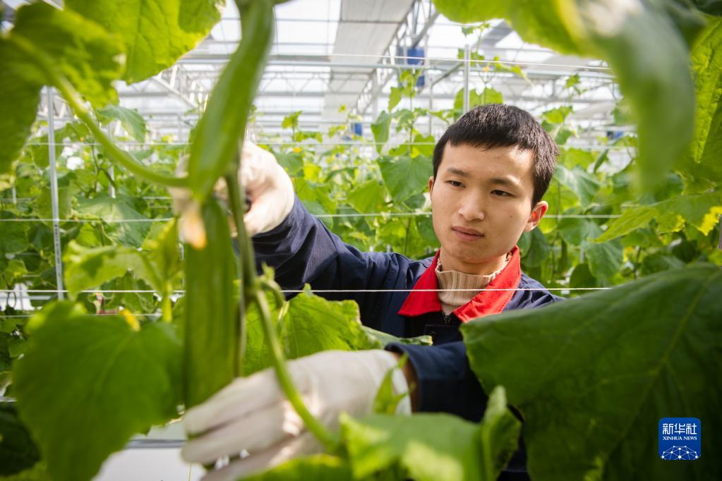 2月15日,工作人員在蔬菜工廠采收水果黃瓜。