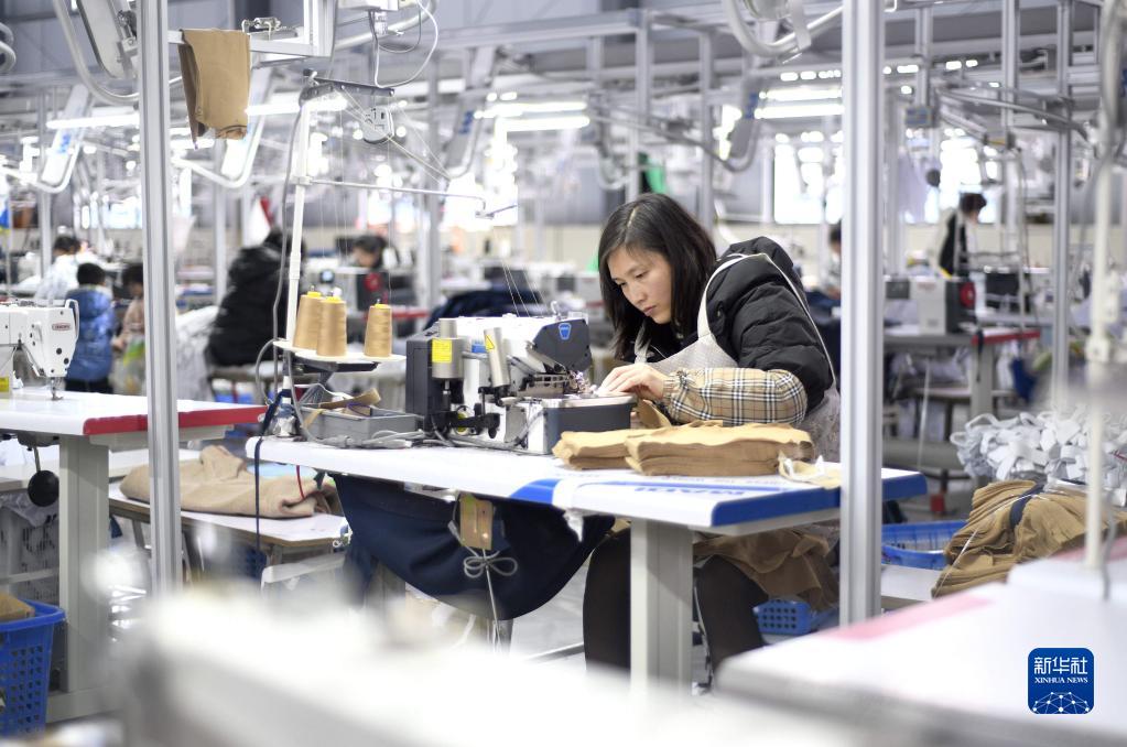 2月15日,工人在貴州省黔西南布依族苗族自治州安龍縣一家服裝企業生產車間加工服裝產品。