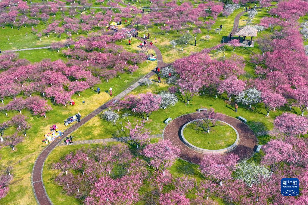 2月16日,游人在浙江省寧波市鎮(zhèn)海區(qū)莊市街道永旺村梅花園游玩(無人機(jī)照片)。