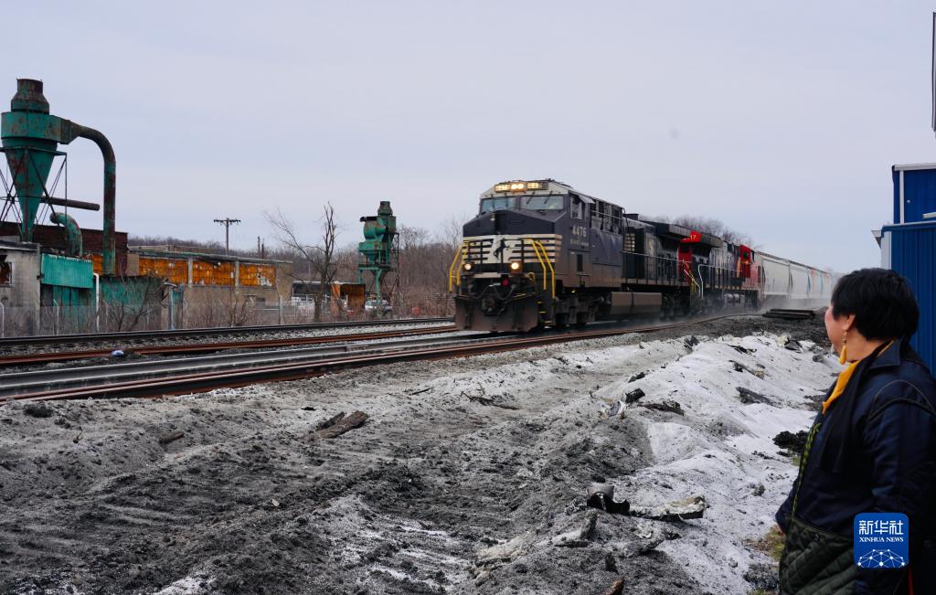 2月14日,諾福克南方鐵路公司貨運列車駛過美國俄亥俄州東巴勒斯坦鎮。