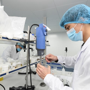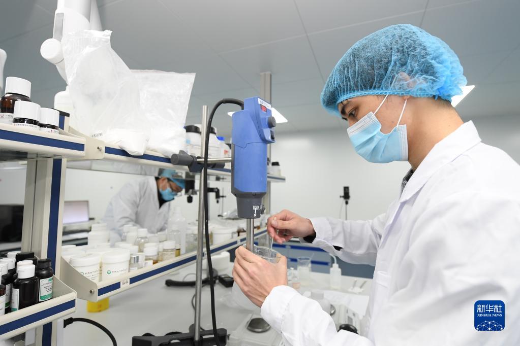 2月16日,在美妝小鎮一家小微化妝品企業,工作人員在實驗室進行新產品的檢測研發。