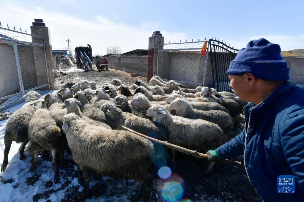 在古浪縣黃花灘鎮黃花灘村,村民將出售的肉羊趕出養殖圈舍(2月15日攝)。