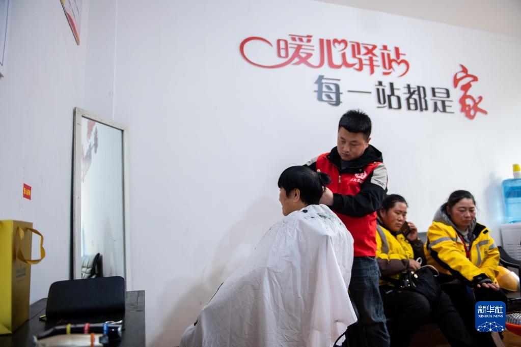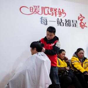 2月16日,在汨羅市歸義鎮友誼河社區“暖心驛站”,志愿者為戶外勞動者義務剪發。