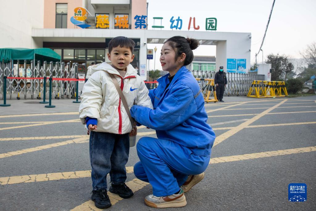 2月16日早晨,岑福珍在幼兒園門口為兒子羅亮整理衣服。