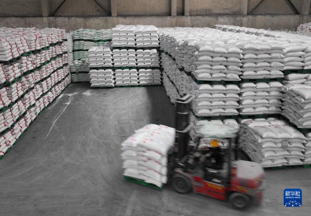 2月16日,在貴州省貴陽市開陽縣一家化肥生產(chǎn)企業(yè),工人駕駛叉車轉(zhuǎn)運(yùn)準(zhǔn)備外銷的化肥(無人機(jī)照片)。