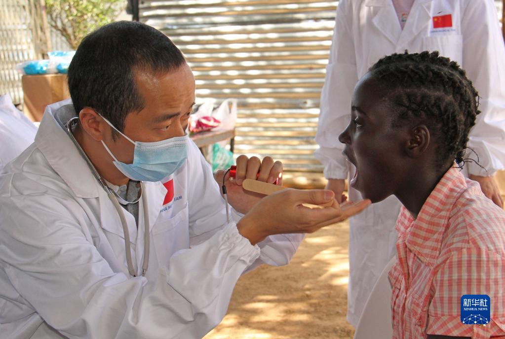 2月16日,在納米比亞首都溫得和克哈瓦那非正式定居點的弗蘭斯藝術培訓中心,中國醫生為一名兒童檢查口腔。