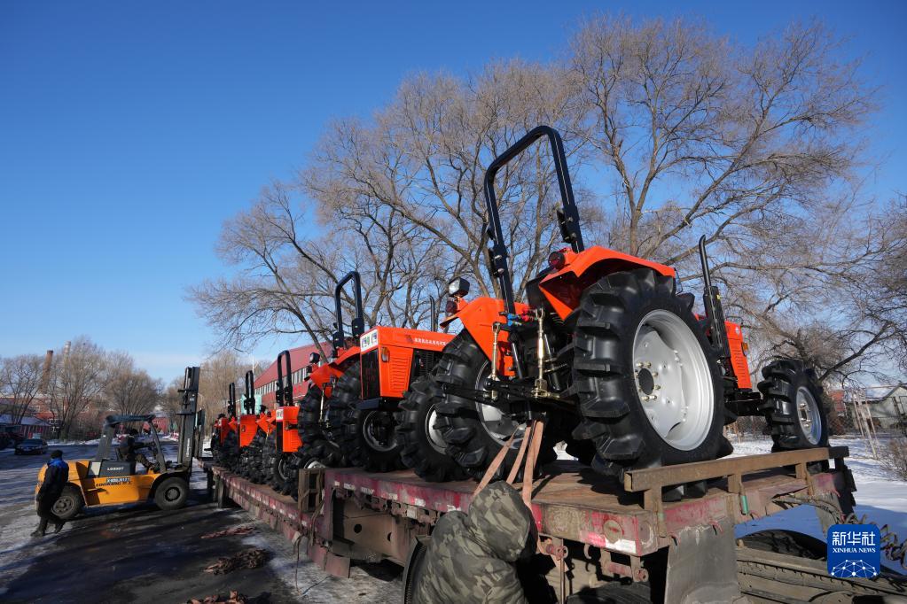 2月16日,佳木斯驥馳拖拉機制造有限公司大院,叉車向運輸車上運送拖拉機。