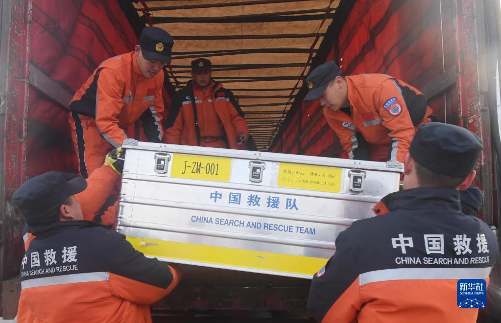2月16日,在土耳其哈塔伊省安塔基亞市,中國救援隊隊員搬運設備。