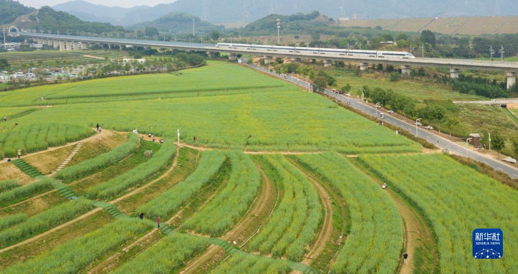 2月16日,和諧號(hào)列車駛過深圳光明區(qū)的油菜花田(無(wú)人機(jī)照片)。
