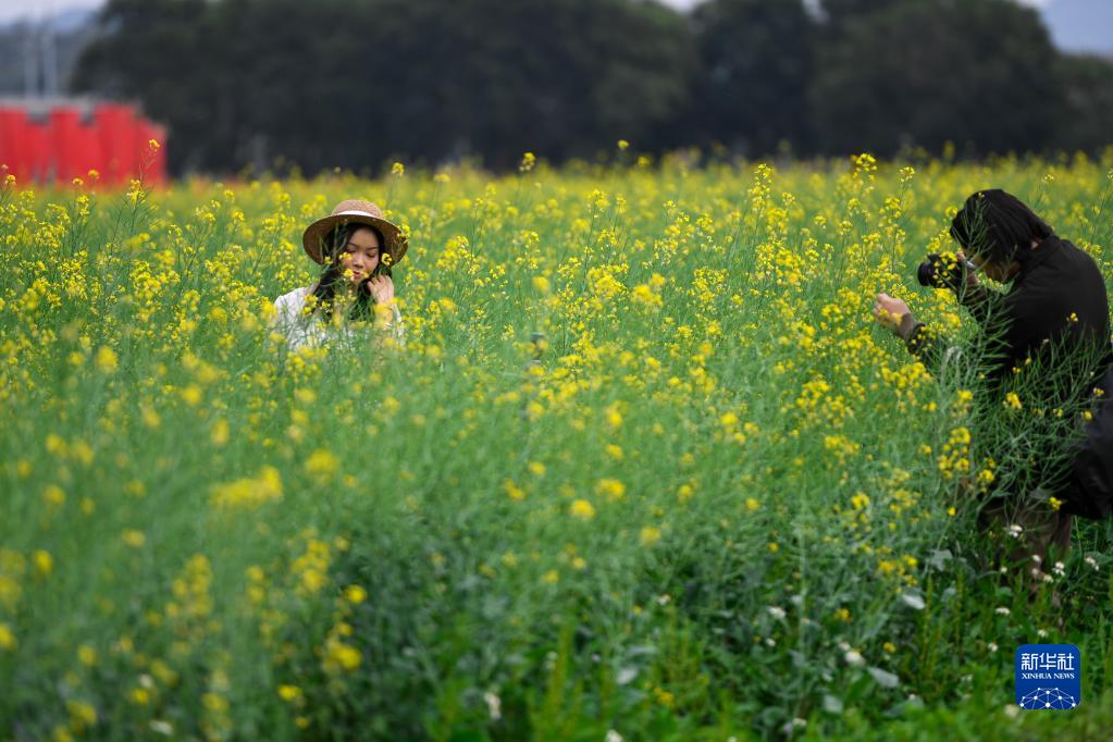 近日,深圳光明區歡樂田園的油菜花開放,吸引市民踏青賞春。