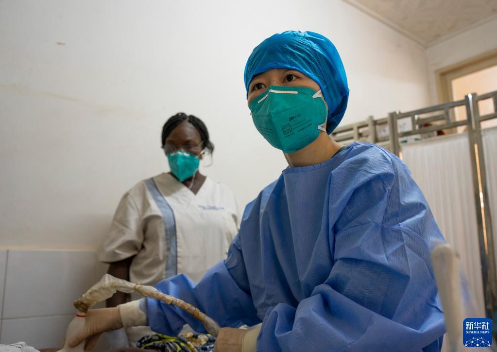 2月14日,在中非共和國首都班吉友誼醫院,第19批援中非中國醫療隊放射科醫生王佳(右)為患者做影像檢查。