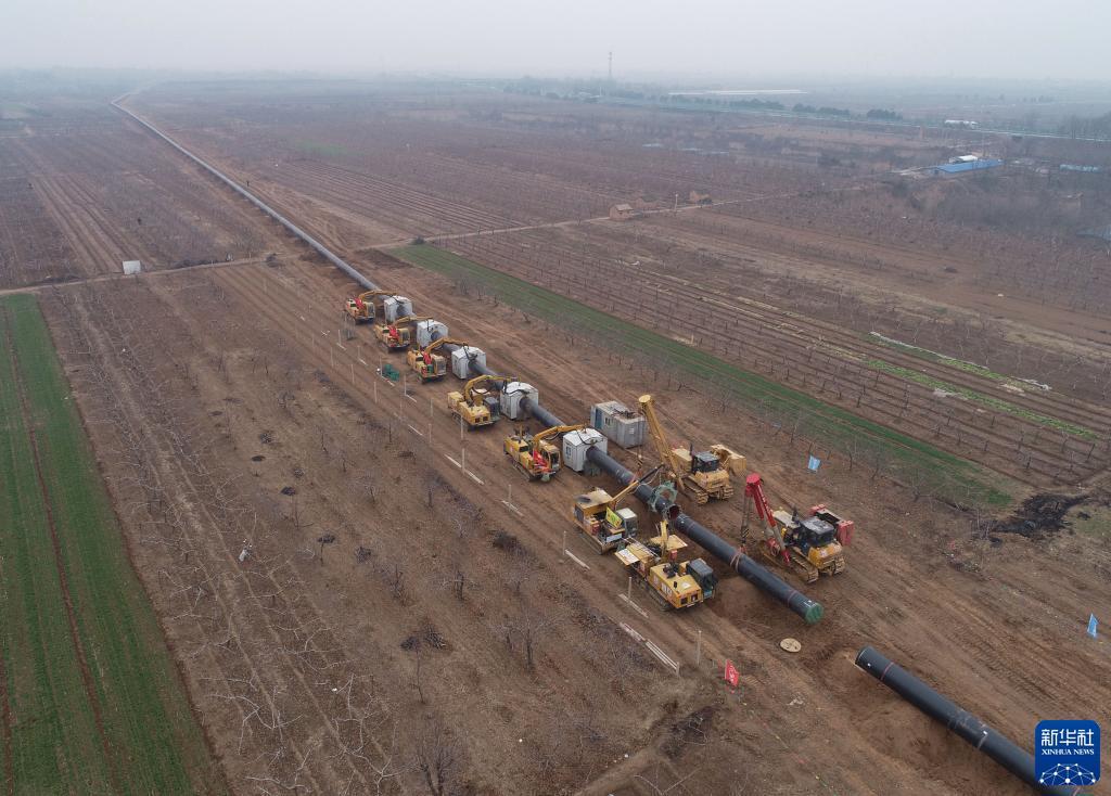 這是2月16日拍攝的位于陜西省咸陽市禮泉縣的西氣東輸三線工程陜西段管道鋪設施工現場(無人機照片)。