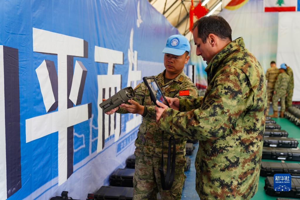 2月16日,在黎巴嫩南部辛尼亞村中國營區(qū),核查官員登記掃雷裝備信息。