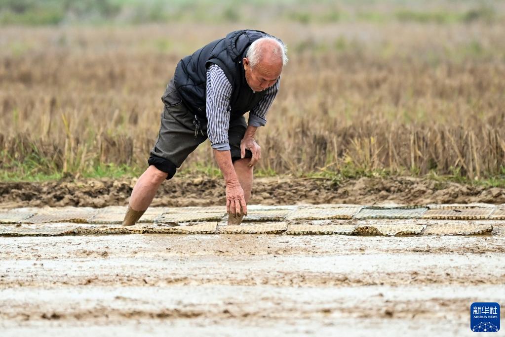 2月17日,廣西欽州市欽北區大寺鎮屯強村委那造村一位村民在田間鋪設秧床。