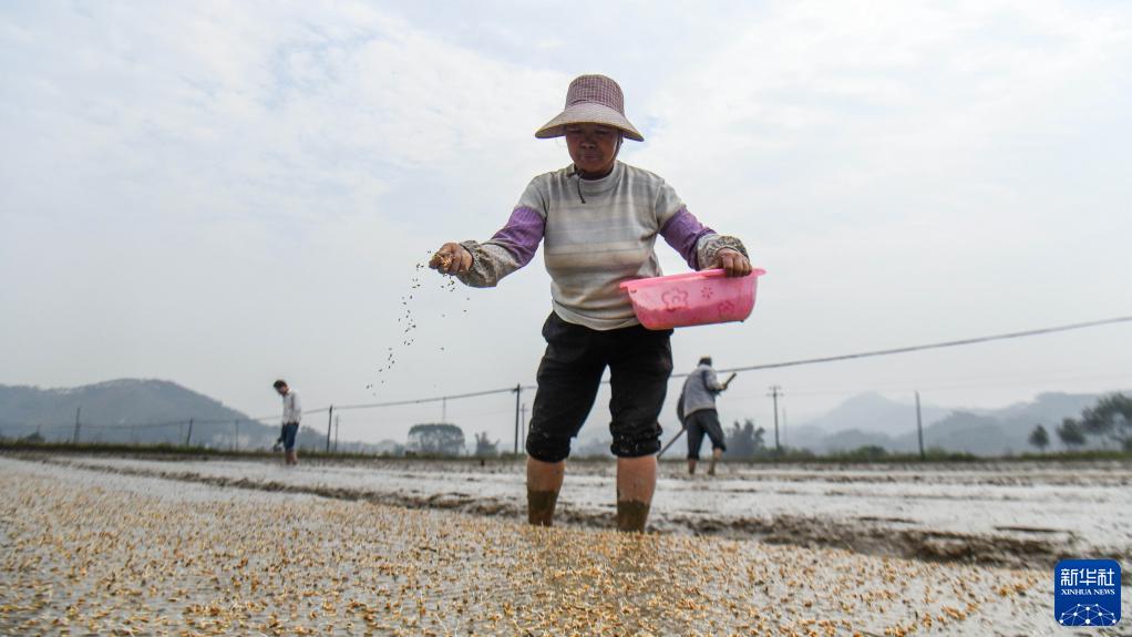 2月17日,廣西欽州市欽北區大寺鎮四聯村委那老村村民在播撒稻種育秧。