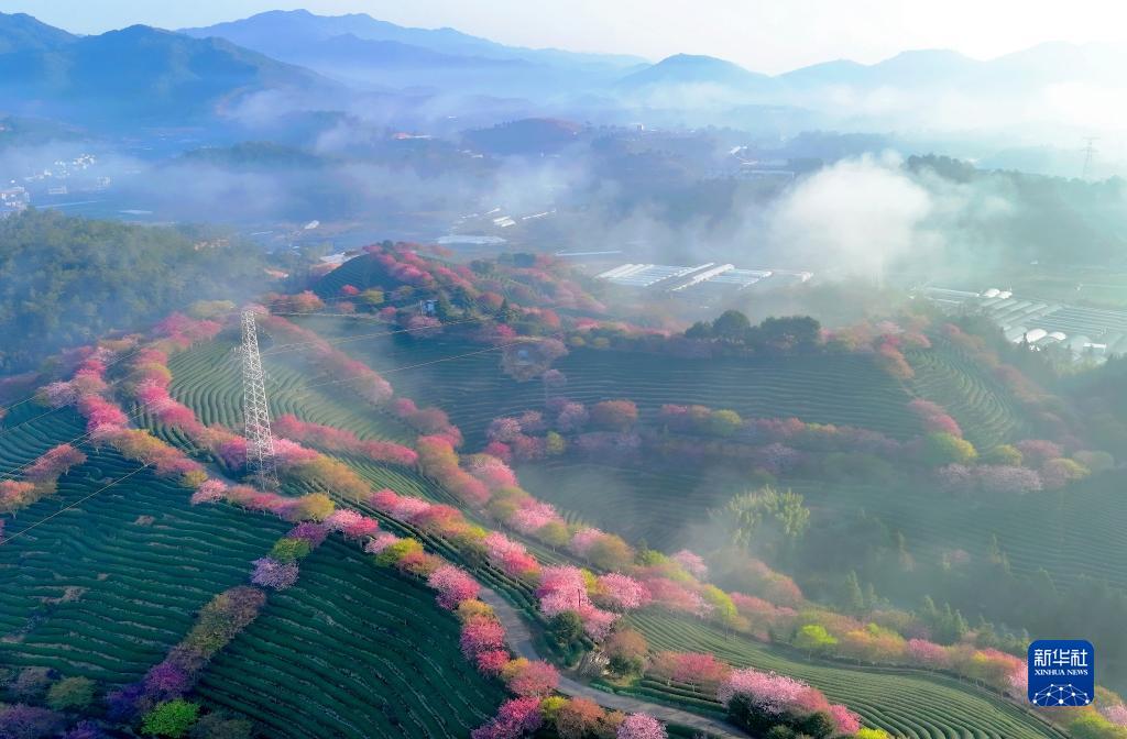 位于漳平市永福鎮的臺品櫻花茶園里云霧繚繞,櫻花盛開(2月17日攝 ,無人機照片)。