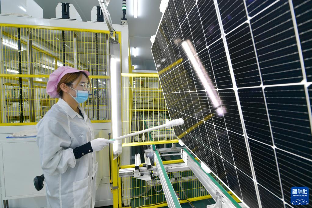 2月16日,工人在古浪縣一家光伏組件生產企業的車間里檢驗光伏組件。
