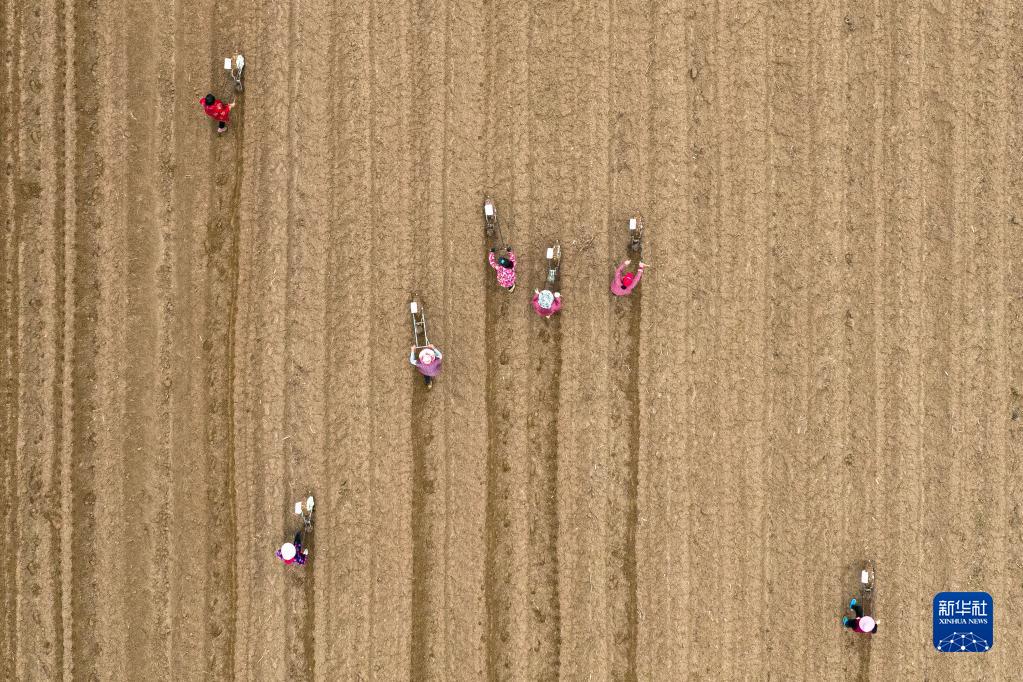 2月16日,村民在湖北省武漢市經開區鄧南街田間進行播種作業(無人機照片)。
