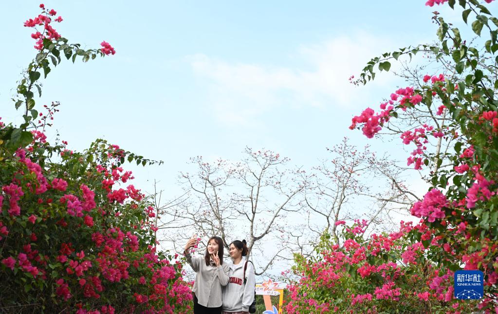 2月17日,游客在海南昌江的木棉樹(后)前留影。