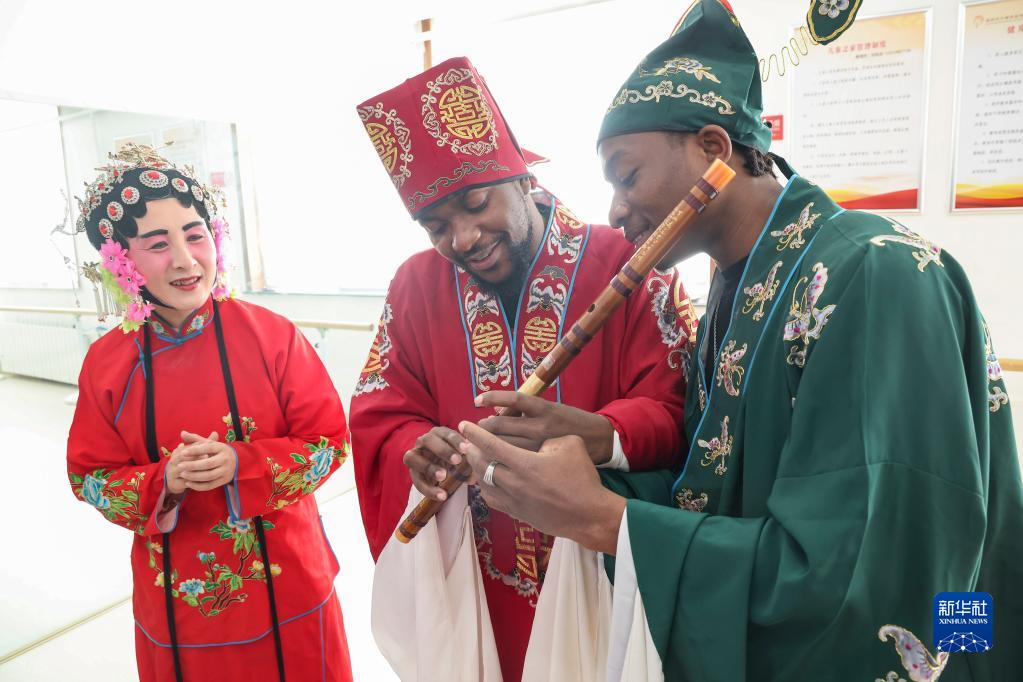 2月17日,在山東省臨沂市蘭山區棗園鎮弦子戲非遺展廳,外國留學生在了解笛子的發聲原理。