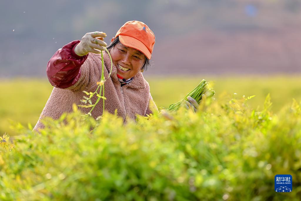 2月17日,浙江省杭州市淳安縣千島湖鎮坪山生態浮島上,工作人員忙著采摘水生蔬菜。