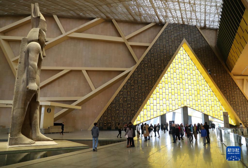 2月11日,游客在位于埃及吉薩省的大埃及博物館入口處參觀。
