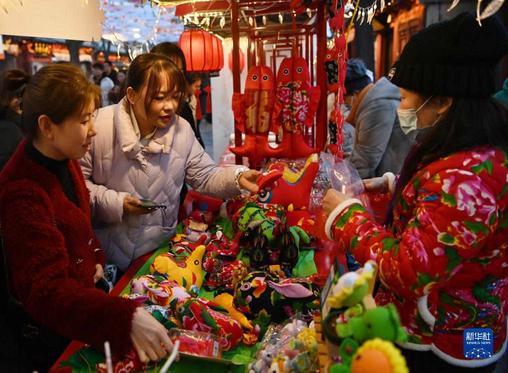 游客在非遺大集上購買濰縣布玩具(2月17日攝)。