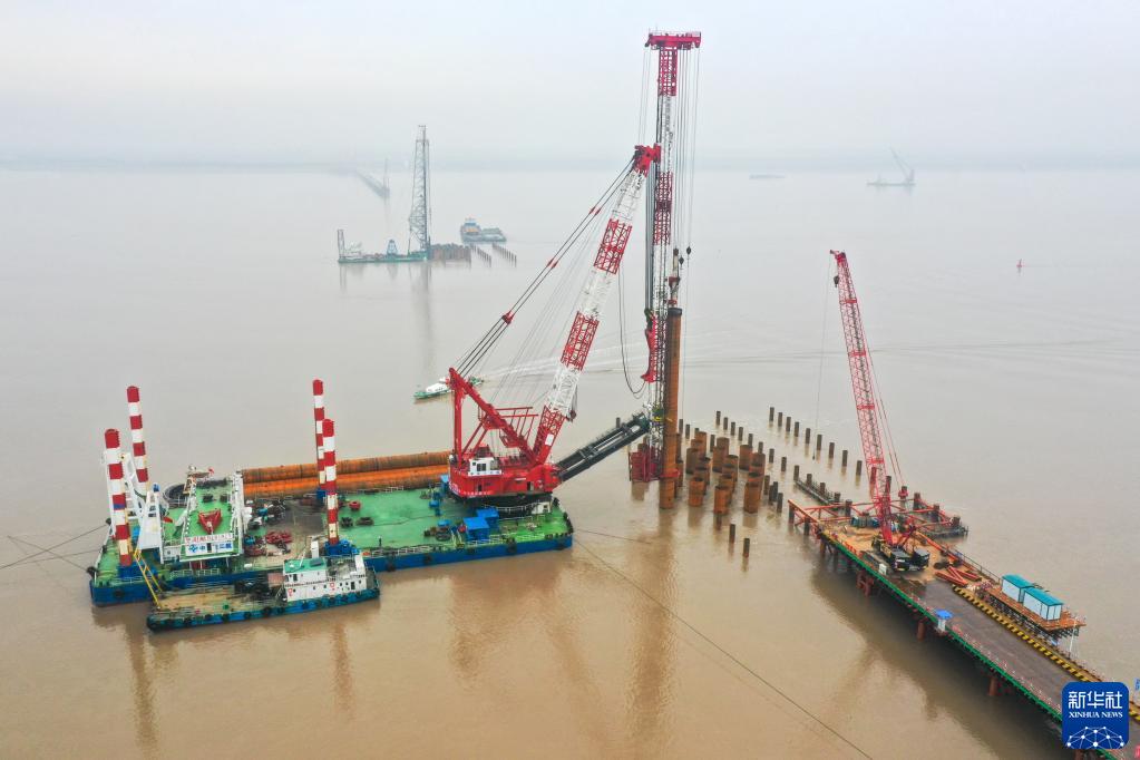 這是2月18日拍攝的崇啟公鐵長江大橋永久鋼護筒施打作業現場(無人機照片)。