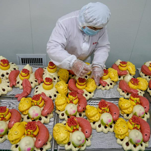 2月17日,威海長林生態農業有限公司員工在十萬級凈化生產車間內制作花餑餑。