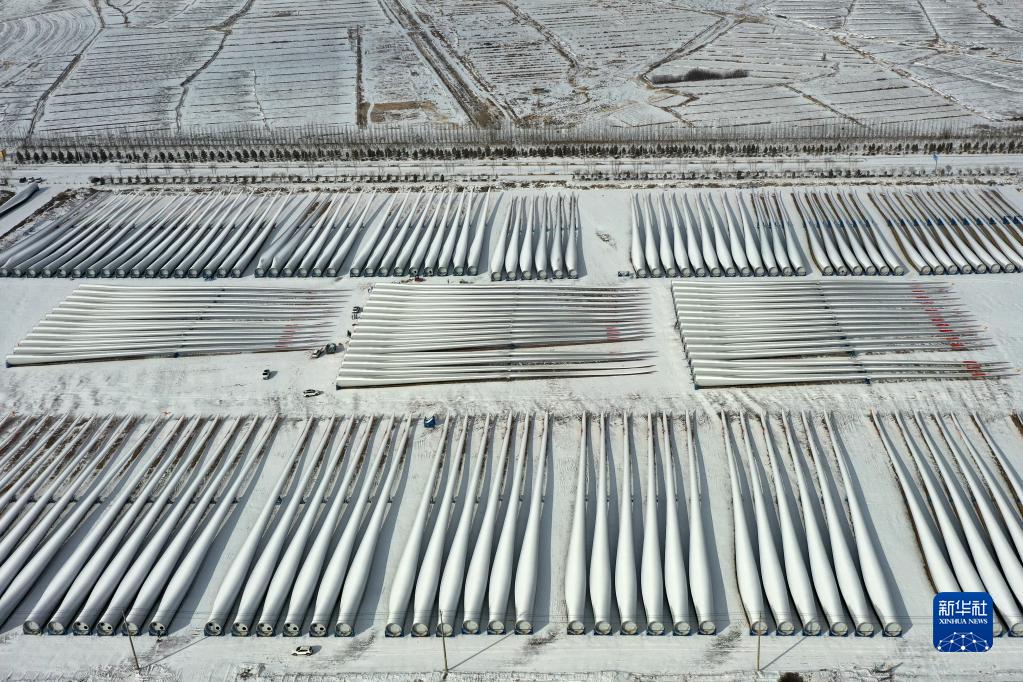 這是2月18日在武威市涼州區一家風電裝備生產企業拍攝的風機葉片成品(無人機照片)。