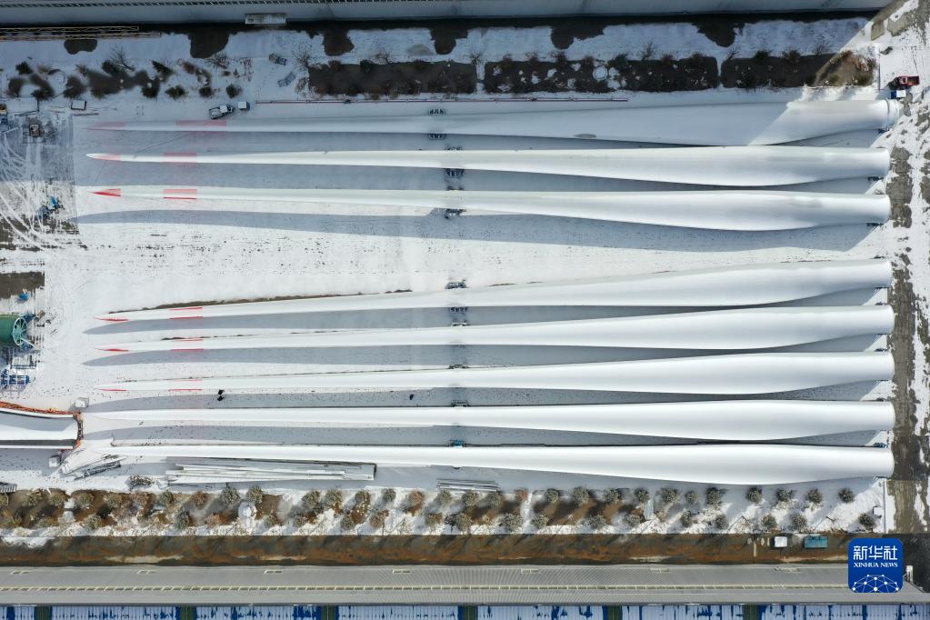 這是2月18日在武威市涼州區一家風電裝備生產企業拍攝的風機葉片成品(無人機照片)。