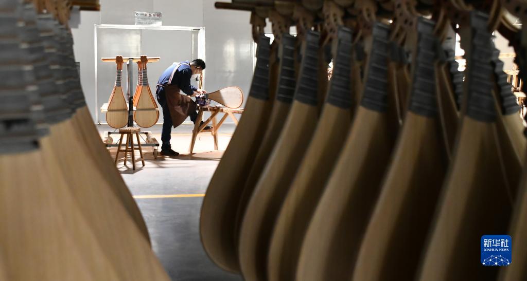 2月18日,河北省肅寧縣一家民族樂器生產企業的工人在生產車間內制作樂器。
