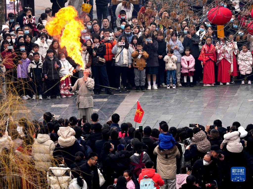 2月18日,游客在開封清明上河園景區內觀看民俗表演。