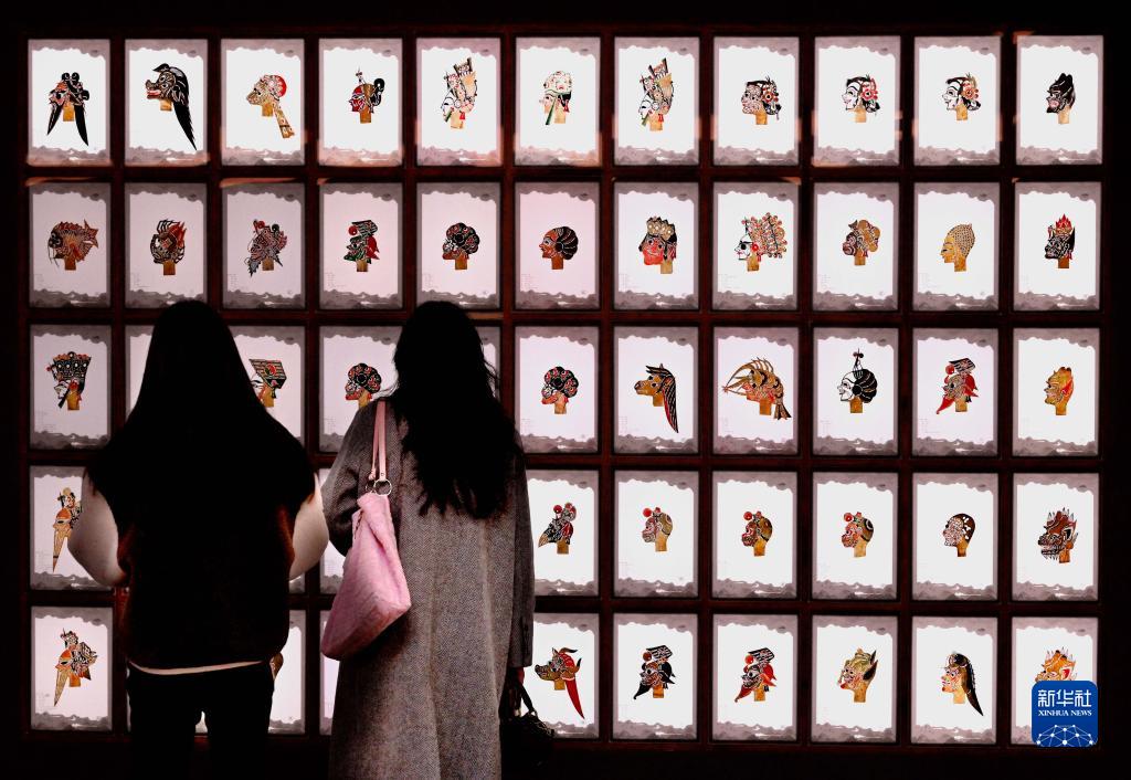 游客在開封清明上河園景區內觀看展示的皮影(2月14日攝)。