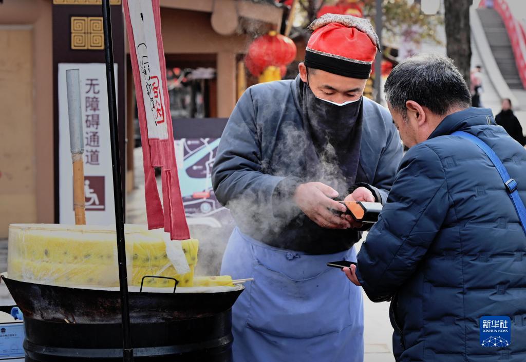 游客在開封清明上河園景區(qū)內(nèi)購買小吃(2月14日攝)。