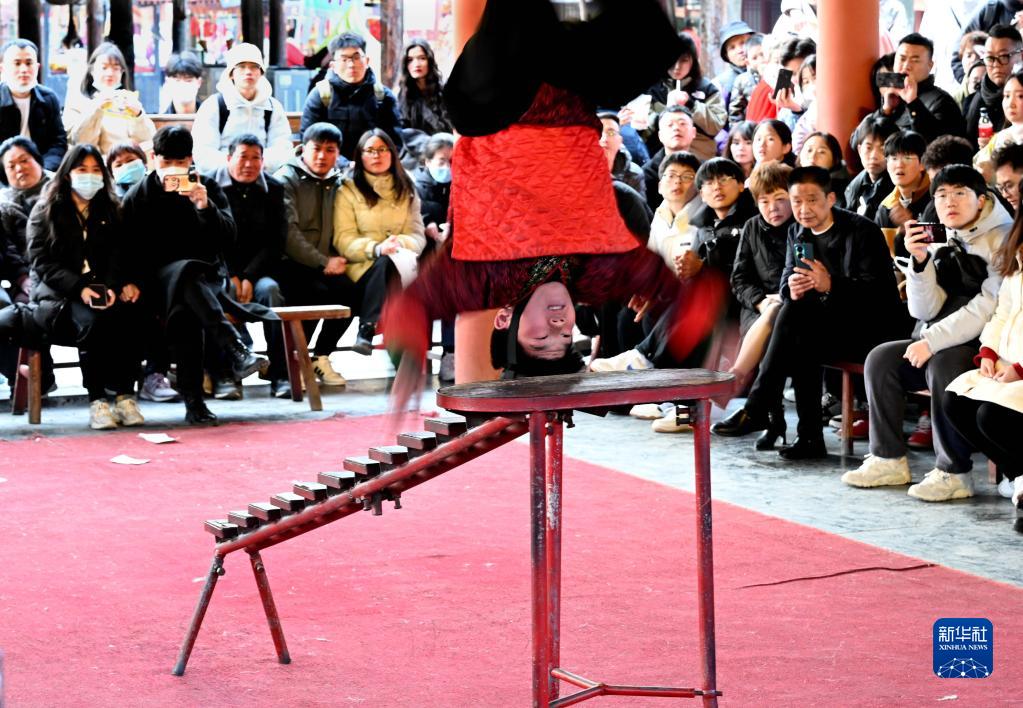 游客在開封清明上河園景區內觀看民俗表演(2月14日攝)。