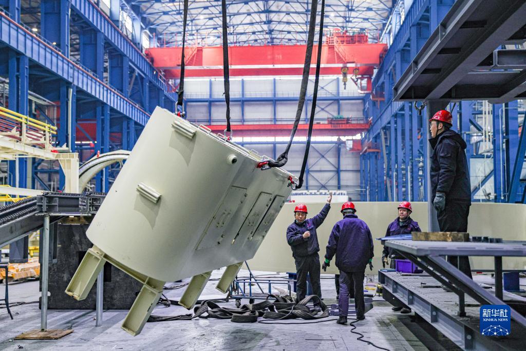 工人在位于遼寧省沈陽市的北方重工有限公司車間吊裝設備(1月13日攝)。