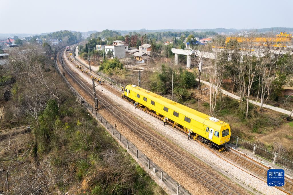 2月19日,在滬昆鐵路婁底至湘潭東區間,一輛快速換軌車正在施工(無人機照片)。