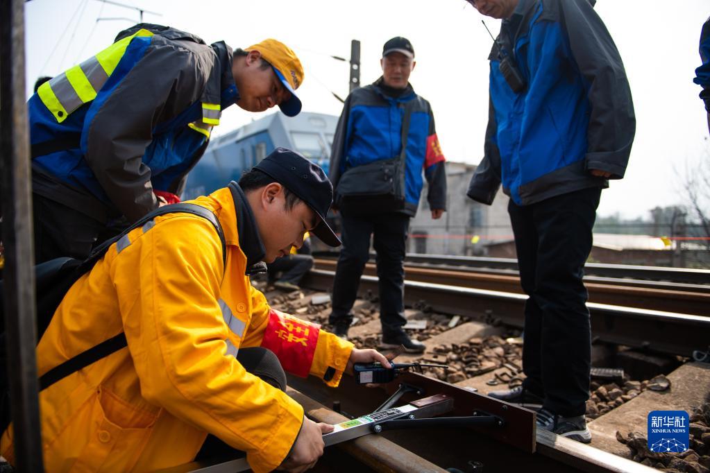 2月19日,在滬昆鐵路婁底至湘潭東區(qū)間,工人使用鐵路方尺給軌道定位。