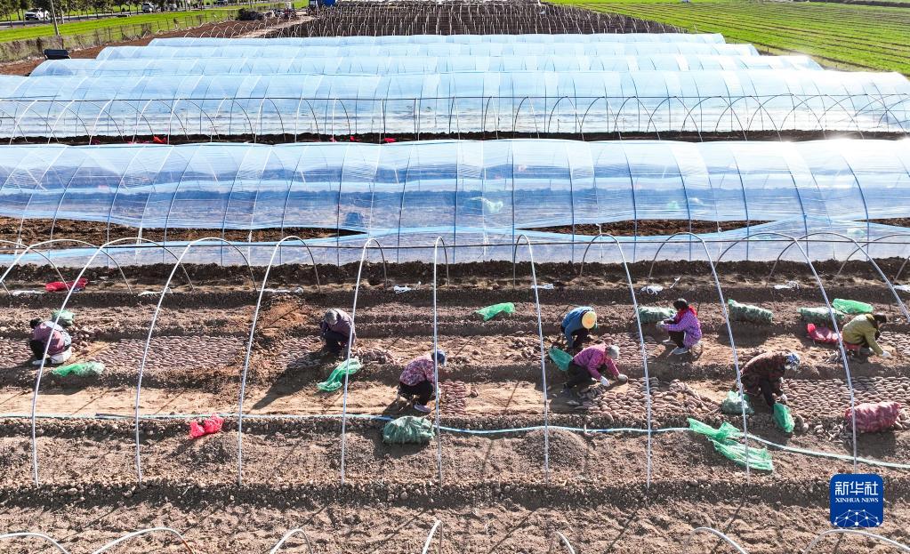 2月19日,農民在河南省濟源市一紅薯繁育基地勞作(無人機照片)。