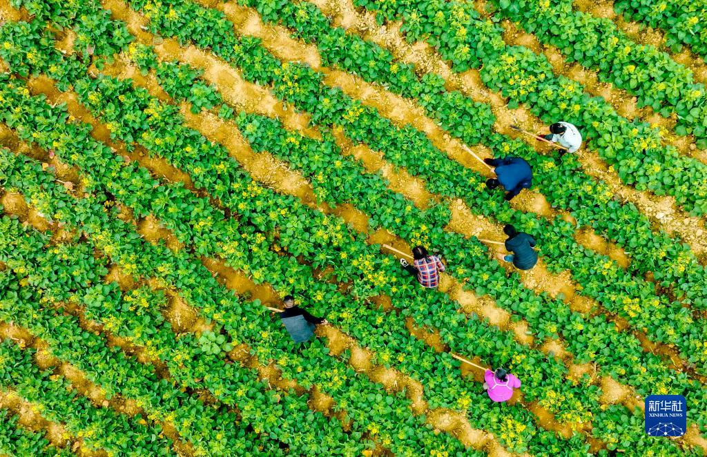 2月19日,村民在貴州省黔西市林泉鎮合心村的油菜地里勞作(無人機照片)。