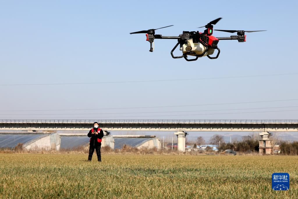 2月19日,在山東省棗莊市光明路街道丁莊村麥田里,農(nóng)業(yè)技術(shù)員操作植保無人機給小麥噴施葉面肥。