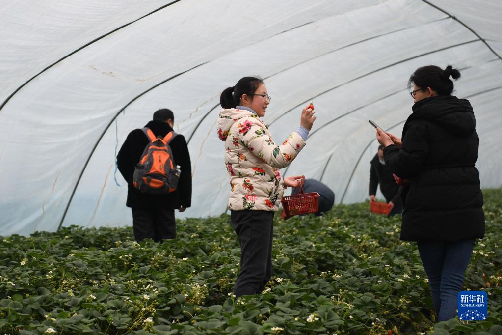 2月18日,孩子和家長在馬郢社區采摘草莓。