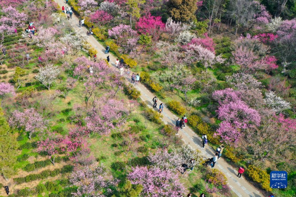 2月19日,游客在江蘇南京梅花山賞花游玩(無人機照片)。