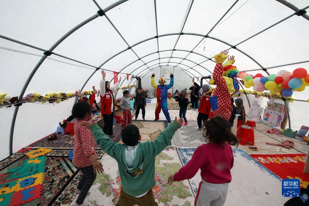 2月19日,在土耳其南部卡赫拉曼馬拉什省卡赫拉曼馬拉什市,孩子們在居民安置點做游戲。